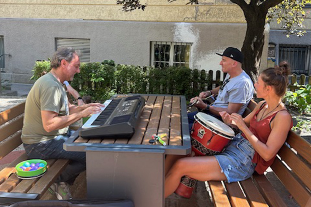 Erich Kowalew, Julia Gampl und Guido Fuchs animieren die Kinder gemeinsam mit ihnen Musik zu machen. Es wird gesungen, geklatscht und ordentlich gerasselt. Eine großer Spaß für Alle, der Dank der Mimi-Stiftung wöchentlich im Hauner stattfinden kann!