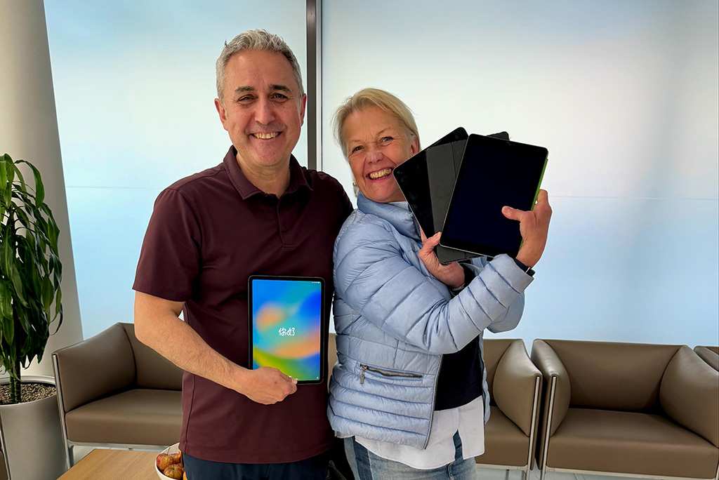 David Mohr, Mitarbeiter der Consumer Retail Sales Abteilung von Apple, hat bereits zweimal beim Social Day in unserer Klinik tatkräftig mitgeholfen. Dabei hat er aufmerksam zugehört, als unsere Pain-Nurse Sabine Lubner-Langener von den Herausforderungen des Schmerzteams berichtete. Daraufhin hat er im Head Office von Apple aktiv eingegriffen und alle ungenutzten iPads eingesammelt!Aria Djamschidi, Leiter des Apple Volunteering / Apple Charity Supports übernahm die Übergabe an den Hauner Verein!