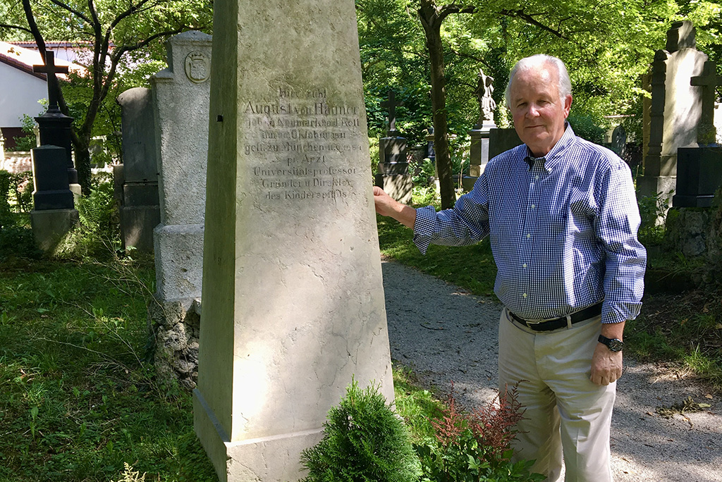 Wir trauern um einen warmherzigen Brückenbauer zwischen Geschichte und Gegenwart und hoffen, die Verbindung zur nächsten Hauner-Generation fortführen zu dürfen. (Auf dem Foto Axel Hauner am Grab von Dr. von Hauner auf dem Südfriedhof)